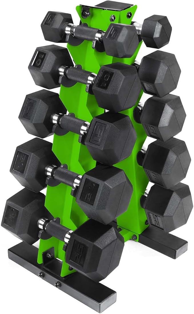 • SET INCLUDES – A pair of 5-pound, 10-pound, 15-pound, 20-pound, and 25-pound coated hex dumbbells with upgraded grip and an A-frame dumbbell rack to store the weights. This set ships in multiple boxes