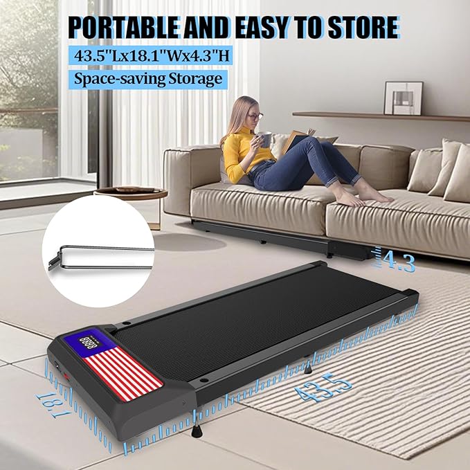 - 【Lightweight & Foldable Design】Weighing just 32 lbs, the foldable walking pad stores easily under desks or beds. Its 4.3-inch profile fits tight spaces in dorms, offices, or small apartments.