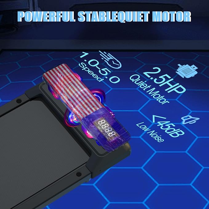 - 【Quiet 2.5HP Motor & 1.0–5.0 MPH Range】Powered by a silent 2.5HP motor, this under desk treadmill operates smoothly at variable speeds, ideal for both workday movement and home exercise routines.