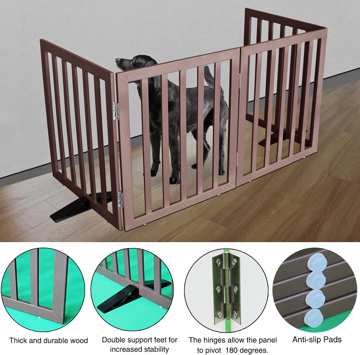 ZJSF Freestanding Indoor Dog Gate for House Foldable Wood Puppy Gate for Doorways Pet Gate for Stairs Extra Wide Pet Fence, Brown, 24" Height 4 Panels