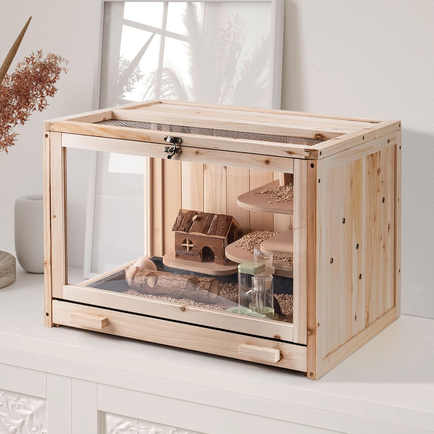 - 【Well-Ventilated & Transparent Design】:Our hamster cage is designed with top wire mesh for optimal ventilation and high-quality acrylic material, The bright large area acrylic glass allows you to observe your pets' activities from multiple angles