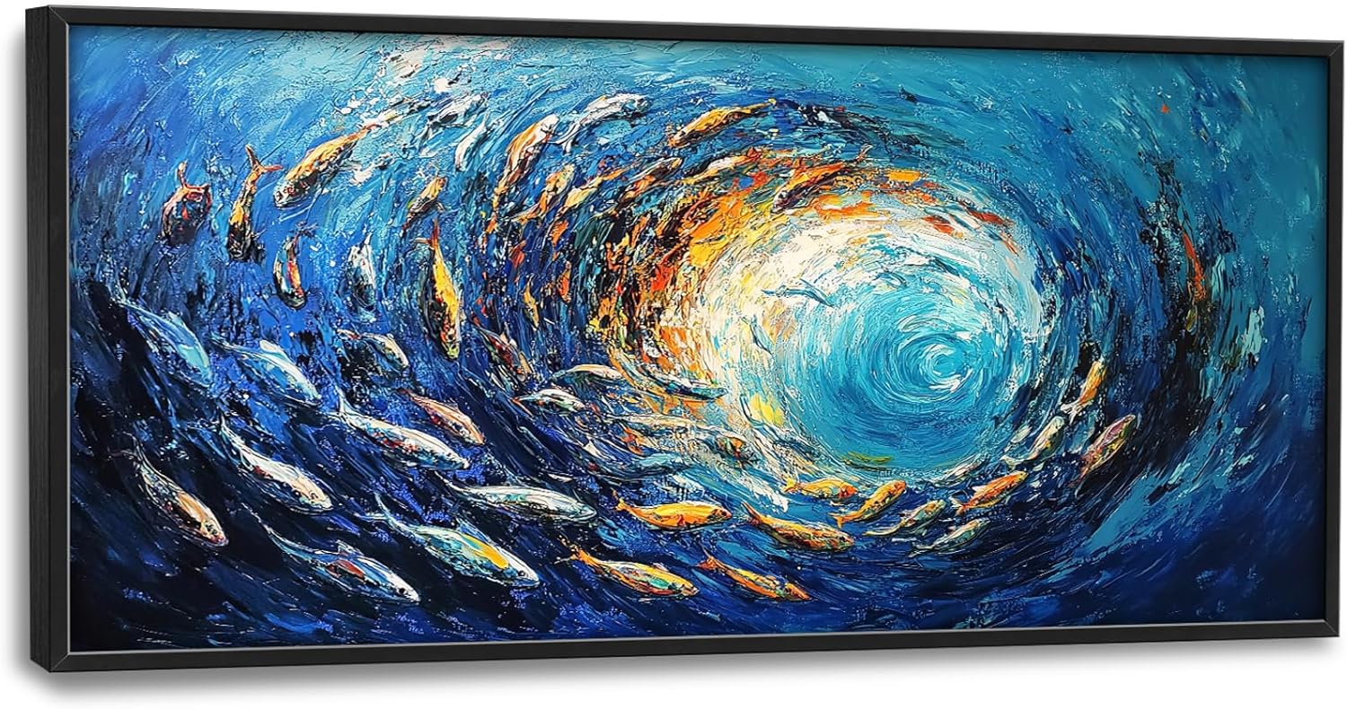 - 【Unique Design】 Oil painting of swirling vortices with fish, vibrant colors, textured brush strokes, large canvas sizes, rich and immersive, sunrays shining upon it, a wealth of details, in the style of Impressionism, swirling motifs, swirling sea, swirling vortices, numerous small fish in the center, against a blue background.