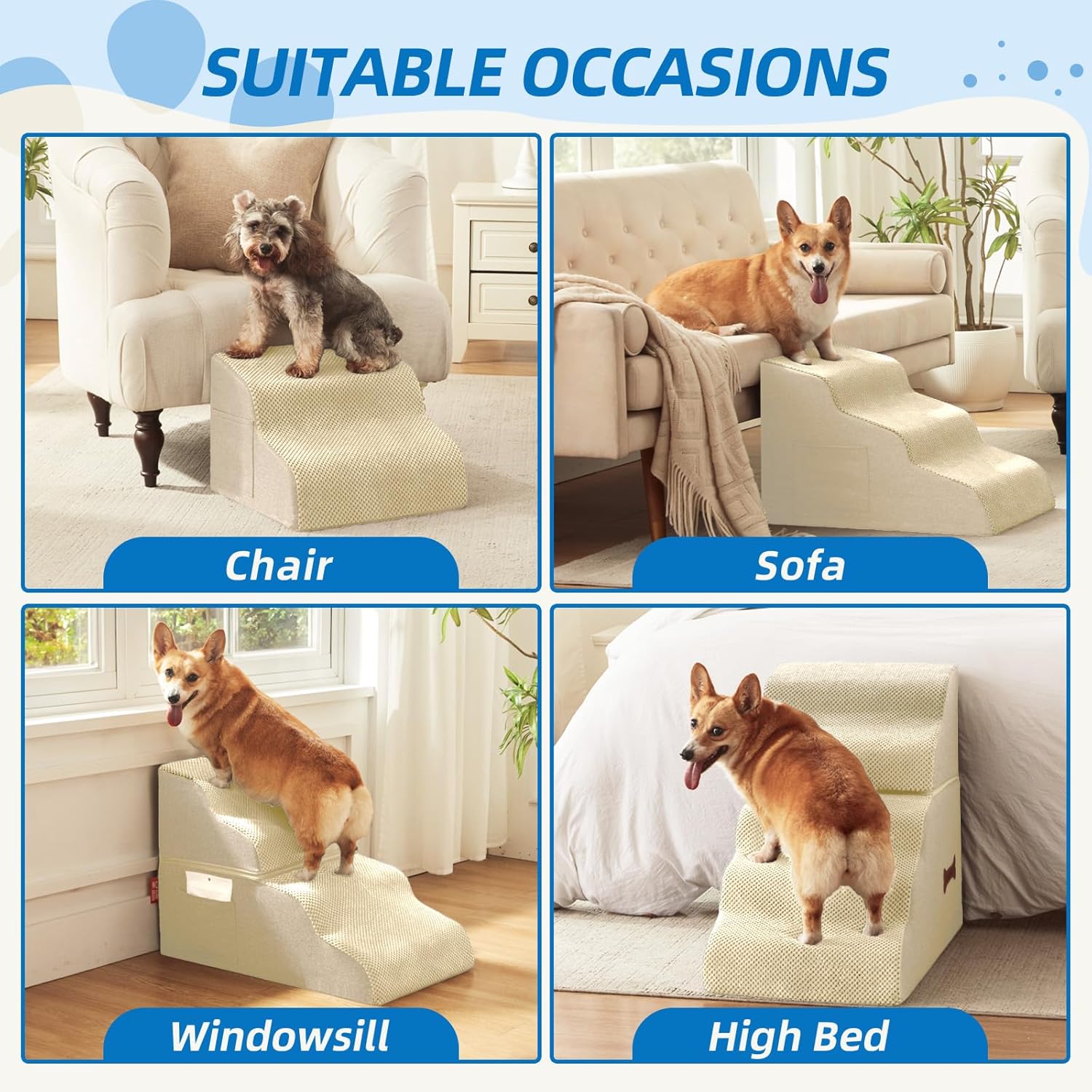 Dog Stairs 3-Step for Small Dogs and Cats to Get on Bed and Furniture/Windows, Pets Can Climb, Sit, or Perch to Look Out Windows, Extra Wide Dog Steps, Non-Slip Waterproof Fabric Cover, Beige(15.7" H)