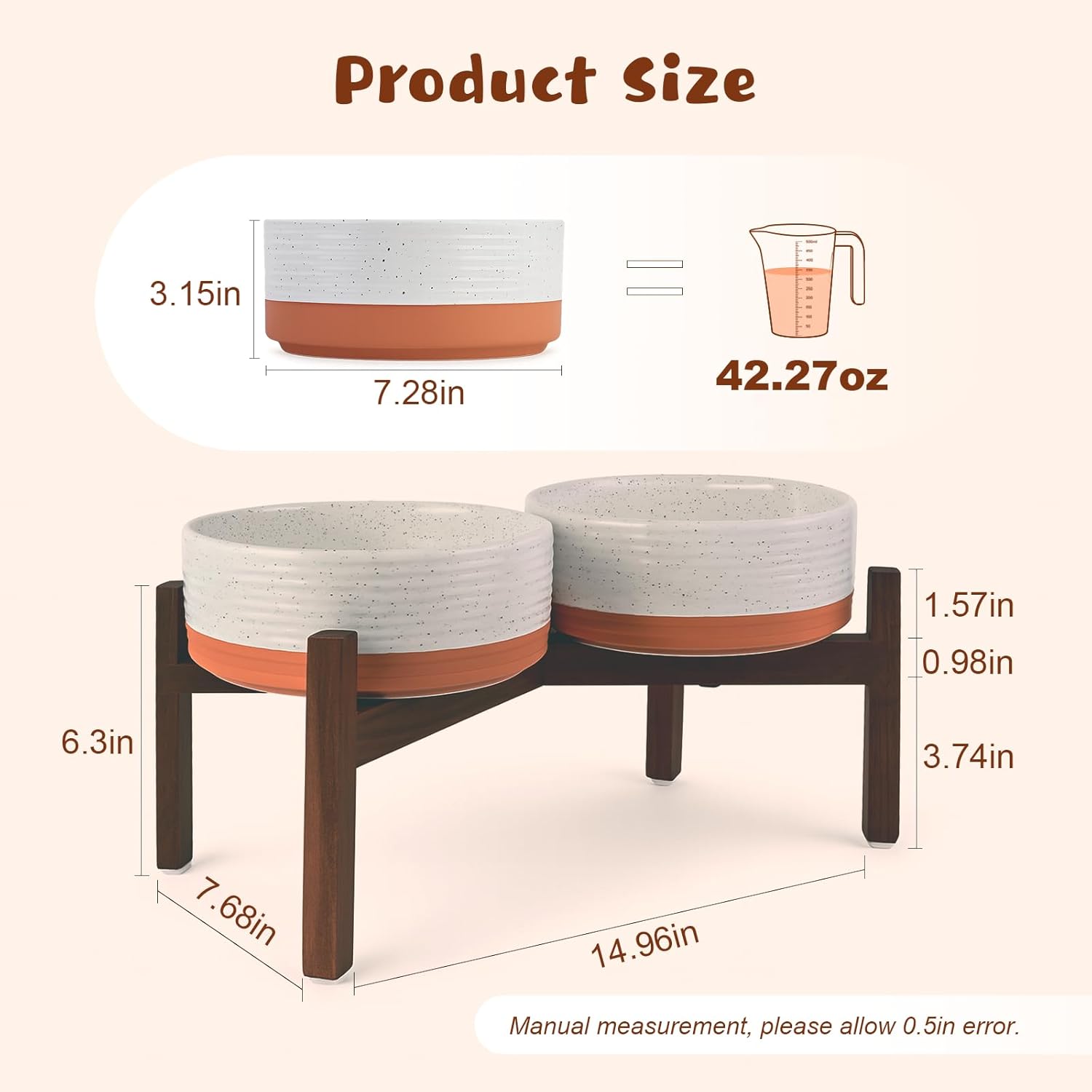 - UPGRADED ACACIA WOOD SHELF: Compared to the usual wood stand, this feeding bowl uses higher quality acacia wood, which not only enhances the overall stability and durability, but also the natural wood grain and warm tone of the wood stand can beautify the home space. The acacia wood stand has better durability and maintains a stable temperament even in humid environments