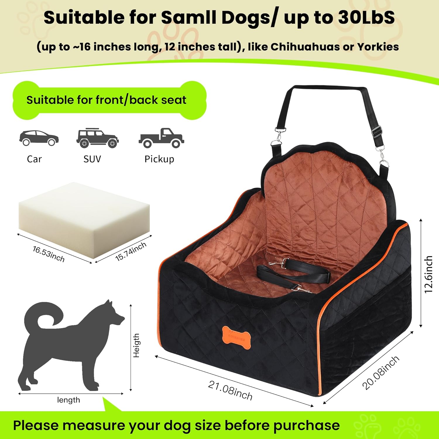 - Perfect Fit for Small Pets Under 30lbs -Measuring 19.7×19.4×12.5 inches, this small dog car seat (and ideal puppy car seat) fits seamlessly in cars, trucks, and SUVs. Designed as one of the most reliable dog car seats for small dogs (and dog carseats for small dogs), it’s easy to install in front or back seats—doubling as a front seat dog car seat when needed. While tailored for small pups, its sturdy build also works for petite cats, earning its place as a versatile pet car seat.