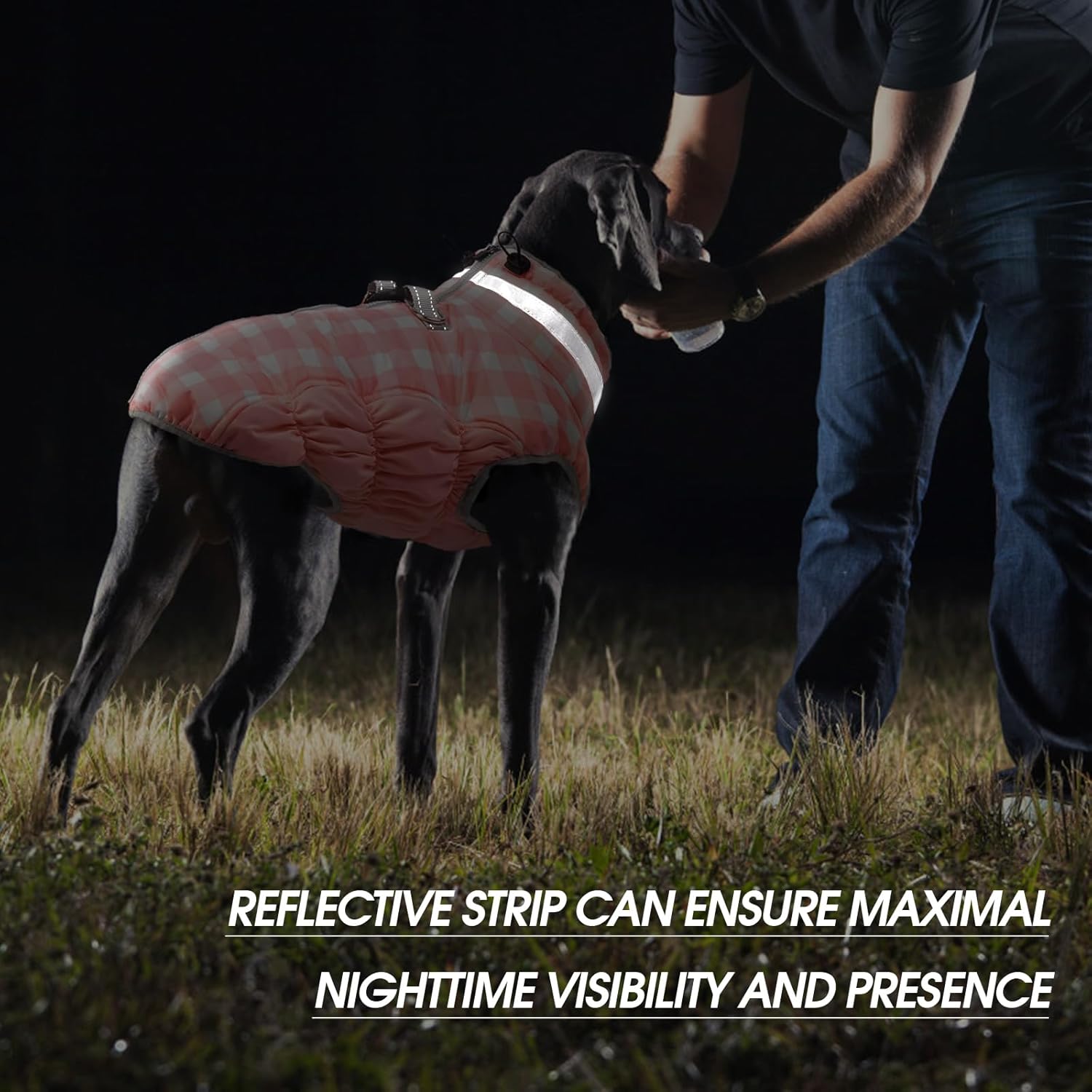 FUAMEY Dog Coat for Large Dogs,Waterproof Dog Winter Jacket with Harness Built in Puppy Cold Weather Coats Reflective Pet Vest with Zipper Warm Fleece Dogs Snowsuit Windproof Pink Plaid 3XL