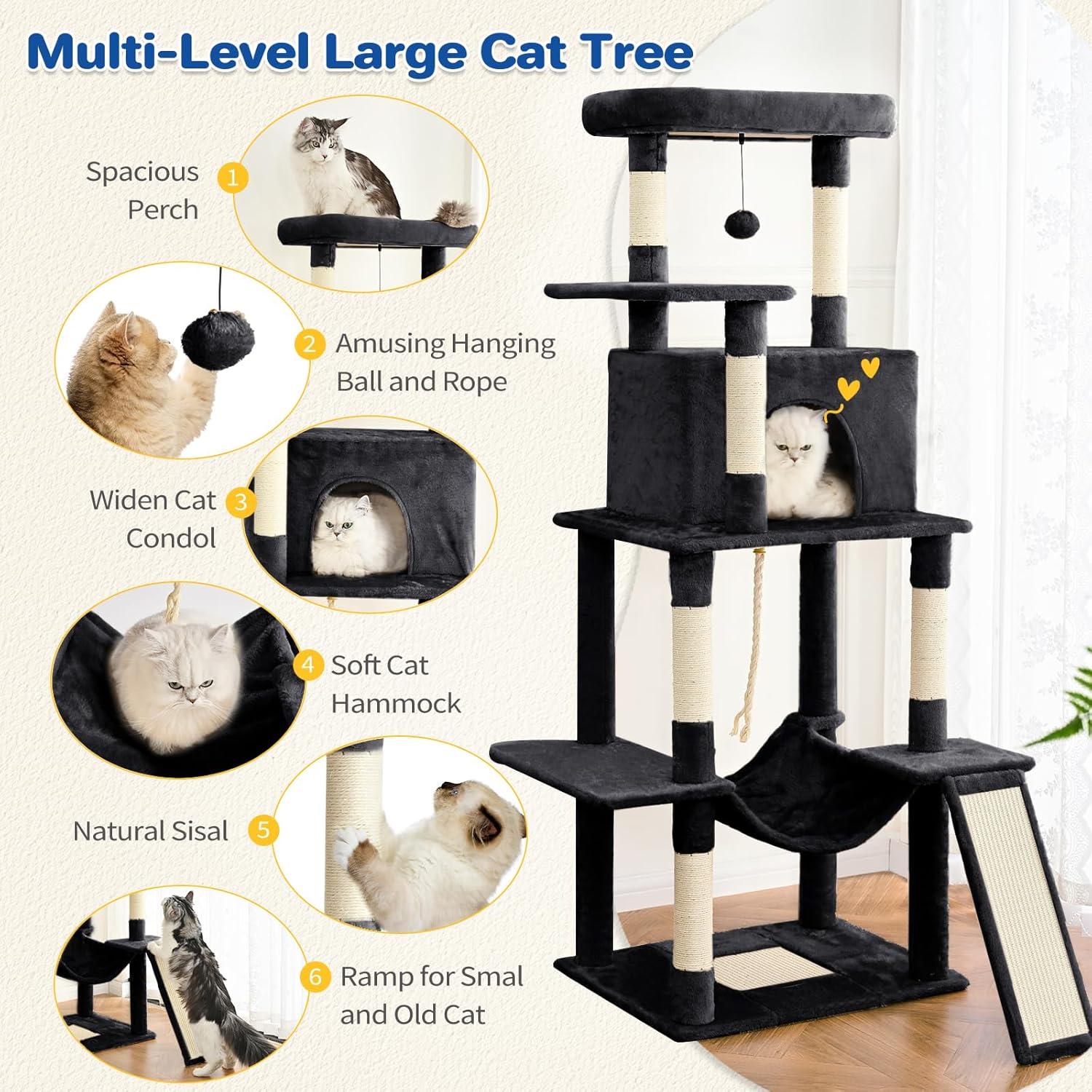 Cat Tree Tower 63in Multi-Level Cat Tower for Indoor Cats with Sisal Scratching Posts, Condo, Hammock, Dangling Ball and Extended Platform for Cats to Play, Black