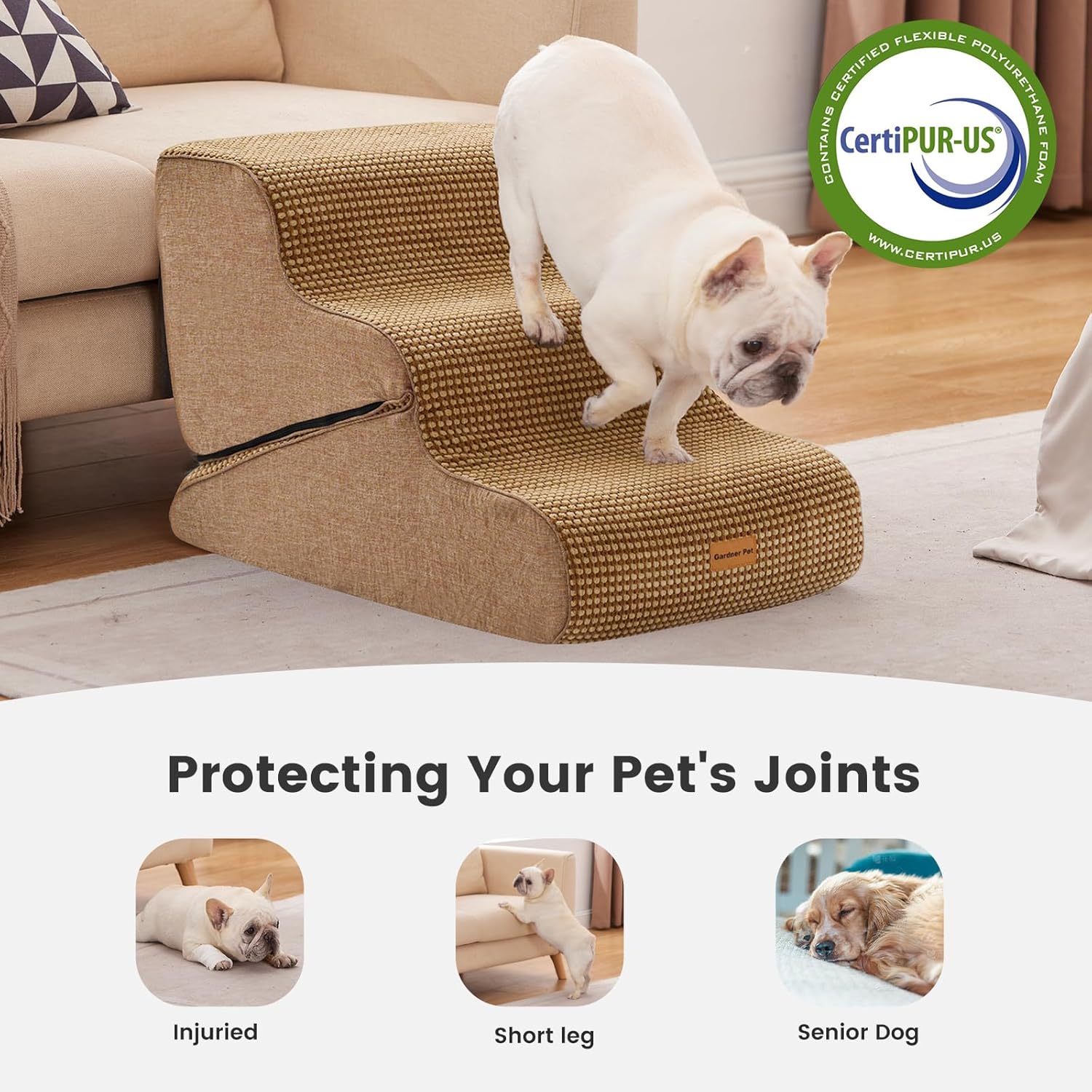 - Stable & Secure with Anti-Slip Base: Designed with rubber dots on the bottom, these pet steps for small dogs provide excellent grip and stability, preventing slips and falls. Your pet can climb confidently and safely. Choose from dog ramp for couch, chair and sofa (up to 18"), 3-step dog steps for couch (up to 20"), 4-step dog steps for bed (up to 25"), or 5-step (up to 28") dog steps for high bed, window and car.