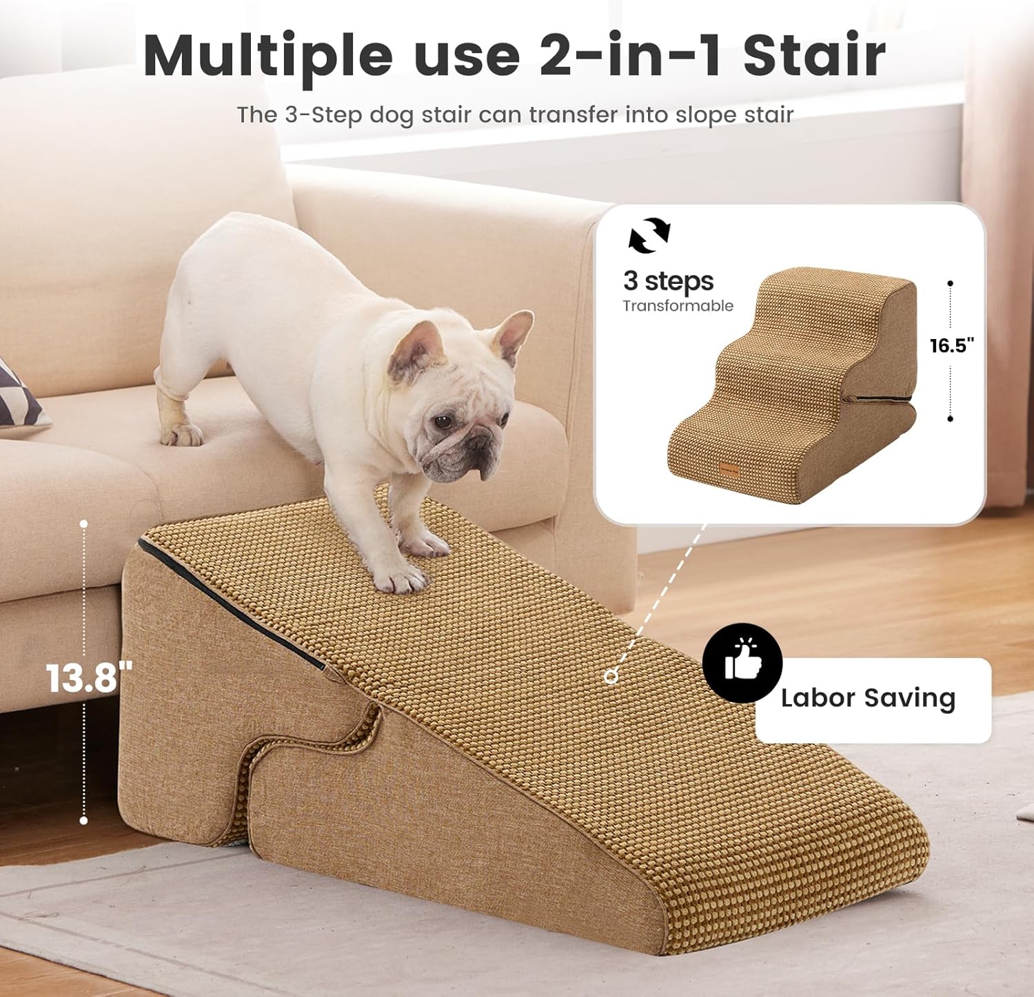 - Stairs & Ramp 2-In-1 Design: The 3-tier brown adjustable dog stairs feature an innovative 2-in-1 design, functioning both as traditional stairs for dogs and easily transforming into a gentle dog ramp for couch. This versatile design is perfect for chairs and sofas, essentially offering two different heights and designs in one dog stair.