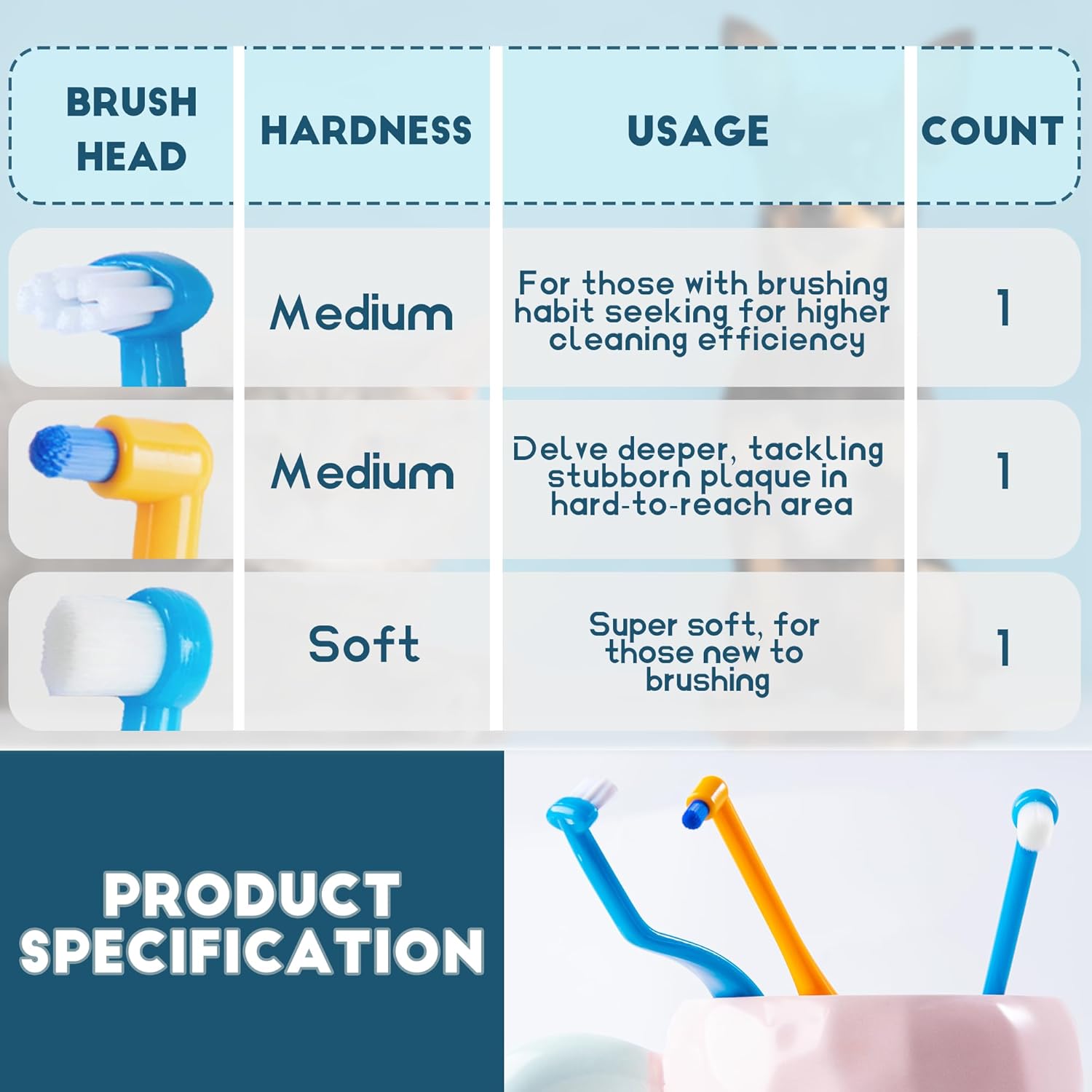 - What You Get - This small dog & cat toothbrush kit includes 3 toothbrushes: 1 soft toothbrush with super soft dense bristles for beginners, 1 tuft head toothbrush for deep detailed dental care, 1 horizontal head toothbrush with medium firm bristles for daily dental care. This design makes it easier for you to clean your pet's teeth, reaching every angle, whether it's the front or the sides
