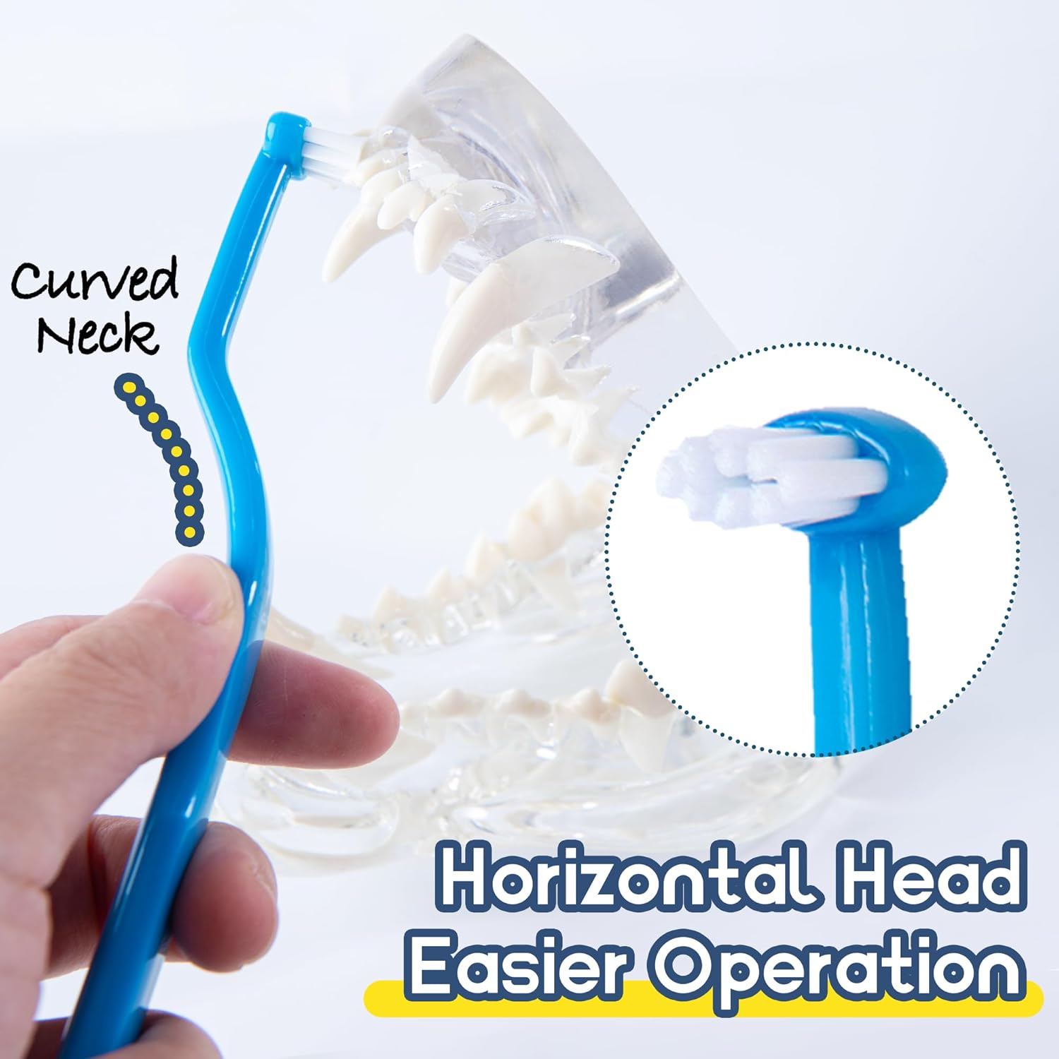 - Thoughtfully Designed & Super Effective Teeth Cleaning Kit - the round brush head is crafted from dense & ultra-soft bristles, perfect for pets who are new to brushing or have sensitive teeth, it delivers a swift yet thorough clean, making oral care a breeze; The horizontal and pointed brush heads are slightly firmer to delve deeper, tackling stubborn plaque in hard-to-reach areas. Together, these brush heads form an unbeatable team