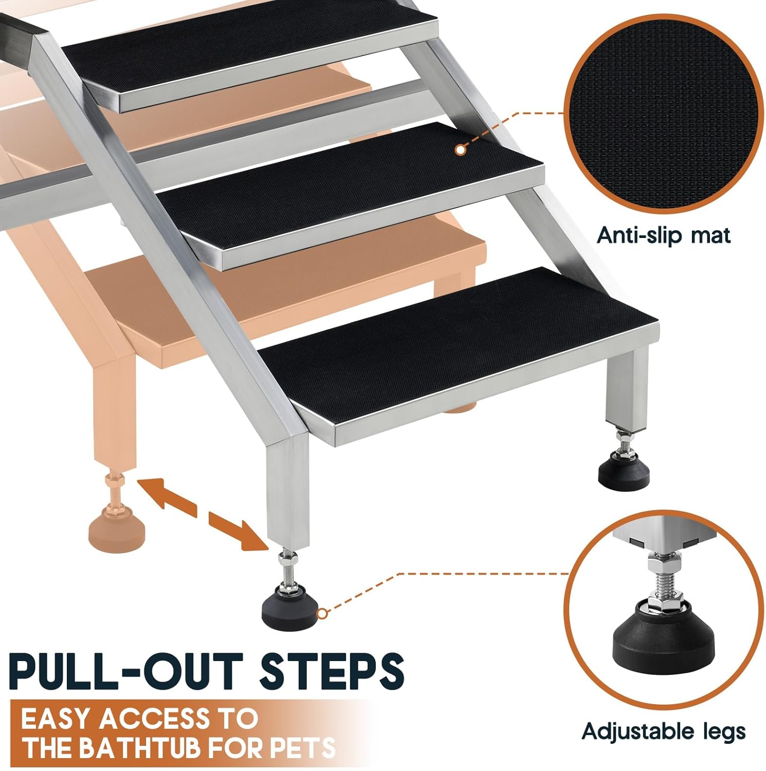 - All-in-one Design: Designed for convenience, the Pet Wash Station comes with pull-out non-slip steps for easy access. It also features an adjustable shower head, S-shaped drain, and a built-in storage rack.