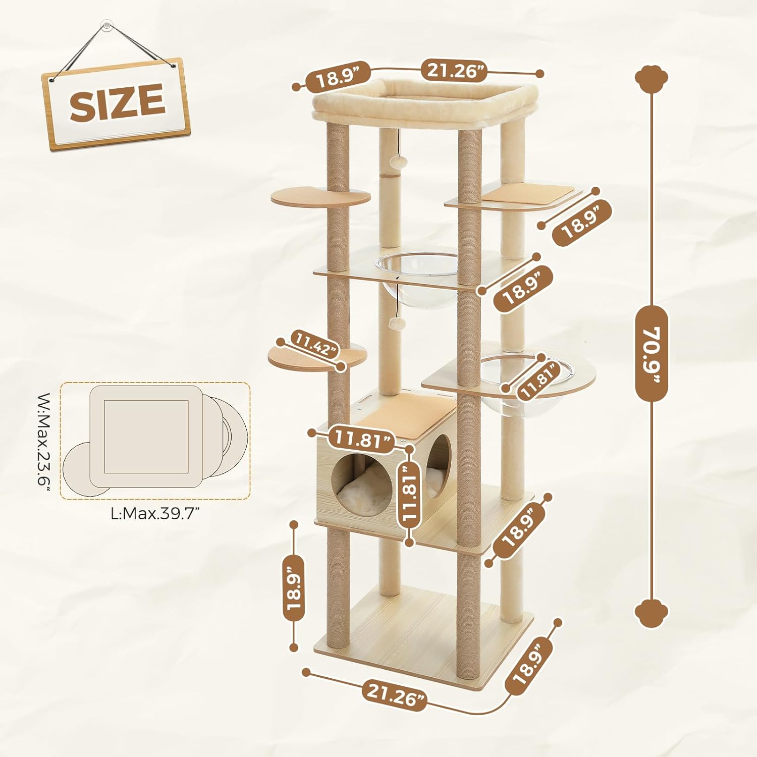 - Whisker Approved Sanctuaries: Spacious 21.26"x18.9" Top Perch invites luxurious stretching; 10 full-wrap sisal posts channel natural scratching urges; Cozy cat condo becomes a safe dreaming haven; Clear acrylic pods spark curious window gazing