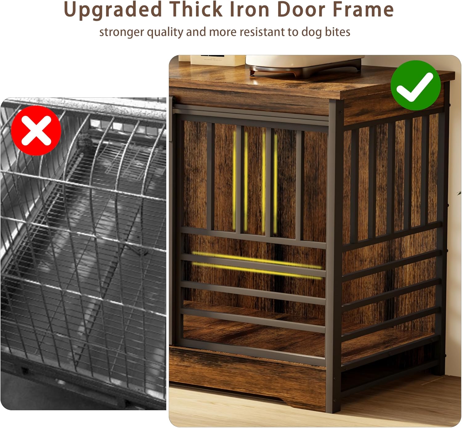 - 【Reliable, Safe & Interactive】Double dog crate crafted with high-quality metal bars and sturdy wood panels, this dog crate ensures both durability and interaction. The reinforced wood frame and robust steel tubing can support up to 300 lbs, offering exceptional stability and chew resistance compared to typical crates. The bar spacing allows you to easily check on, feed, or comfort your dogs without opening the door, providing safety while keeping pets engaged and connected with family life.