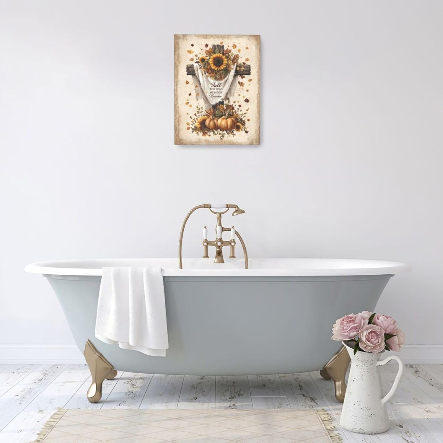 Christian Fall Wall Art Autumn Rustic Cross Sunflower Pumpkin Wall Decor Fall for Jesus He Never Leaves Pictures Painting Print Framed Artwork Decorations Gifts for Living Room Bedroom Prayer Room Office 16"x20"