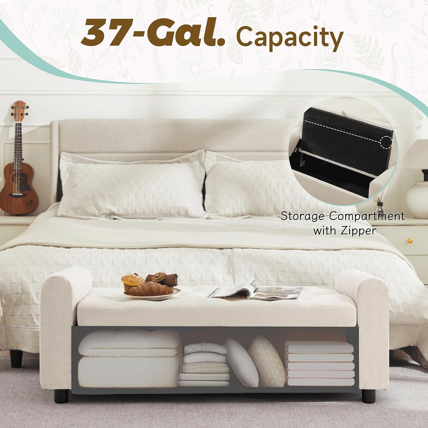 Ottoman with Storage, Tufted Storage Bench for Bedroom, 48" Fabrics End of Bed Bench, Upholstered Entryway Shoe Benches with Rolled Arm & Inner Zipper, Window Ottomans Chest without Rivets, Beige