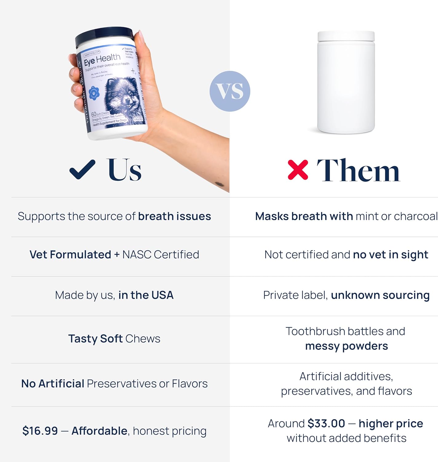 - VET-FORMULATED & TRUSTED QUALITY – Made in the USA in a cGMP-compliant facility with the NASC Quality Seal. These soft chews are vet-formulated and made without artificial flavors or preservatives, so daily eye care is simple and dog-approved.