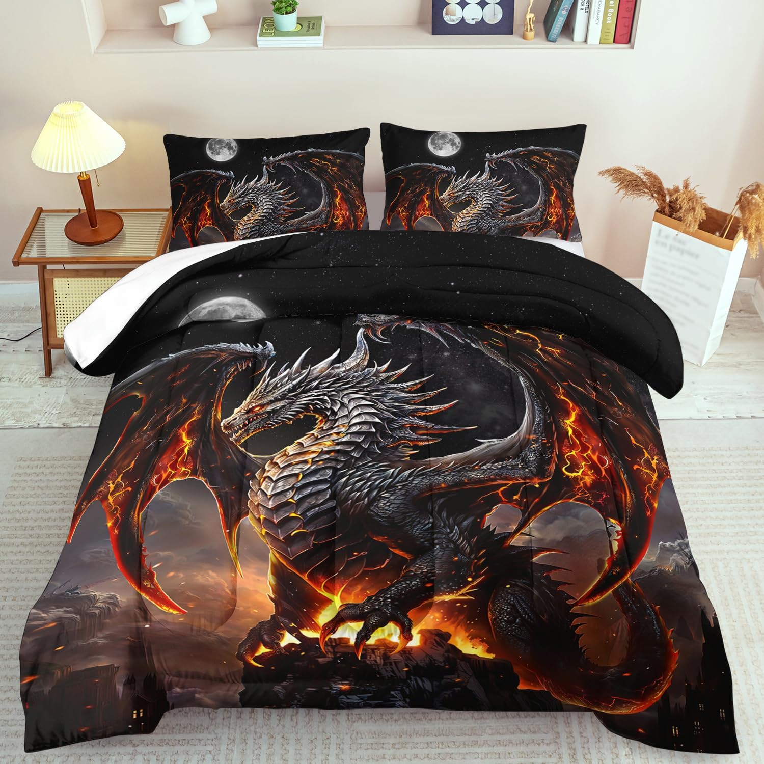 Black Dragon Comforter Set Twin Adult,Flame Dragon Bedding Set for Boys,Magical Beast Bedding Fantasy Animal Comforter Beedroom Decor,Magical Beast Quilt Bed Decor
