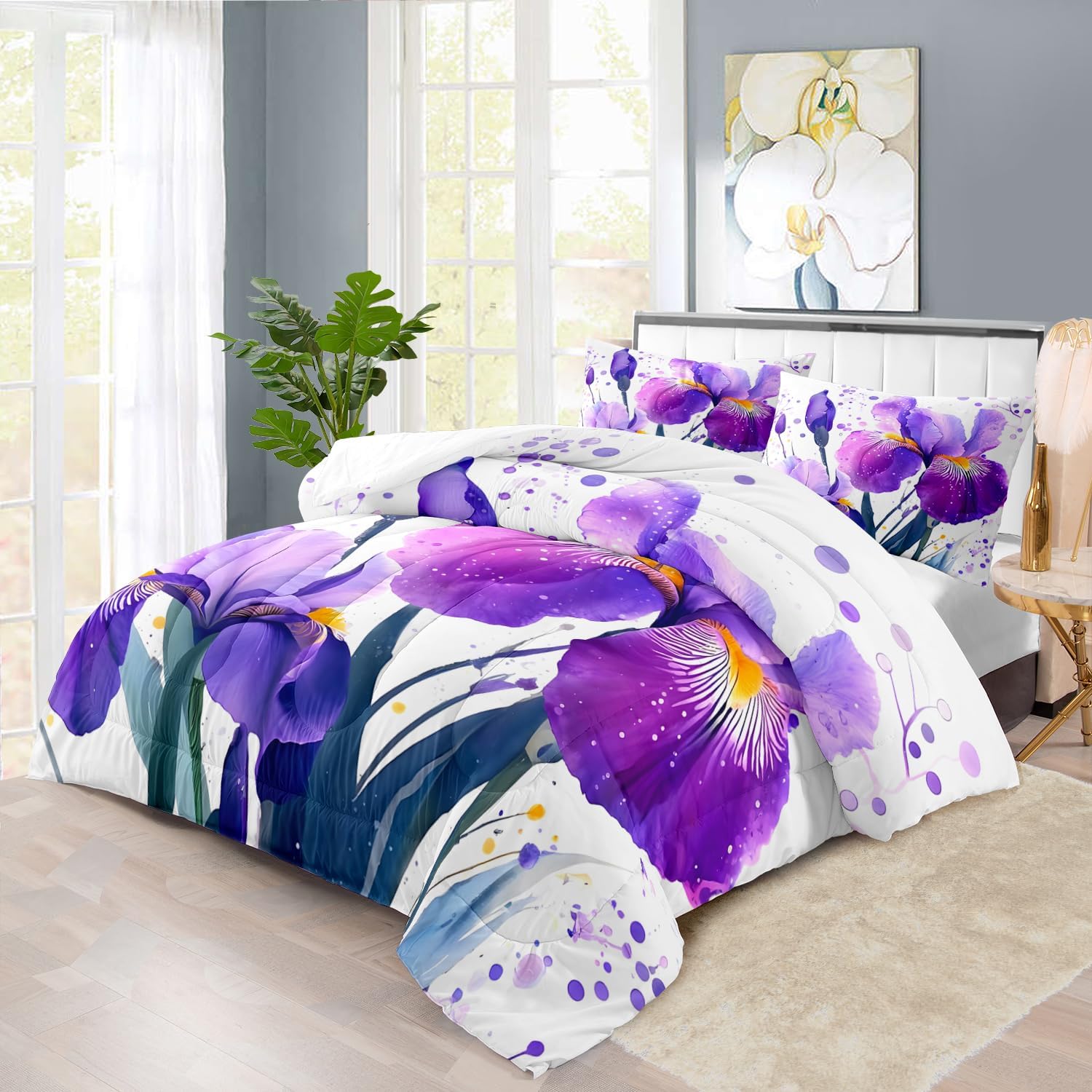 - Twin Size Floral Iris Comforter Set :This bedding set includes 1 comforter(67" x 85") and 2 pillowcases(20”x30”). In order to facilitate transportation, the quilt is made of vacuum compression technology. It will be slightly wrinkled when taken apart, but it will quickly regain its fluffiness if you gently beat it.