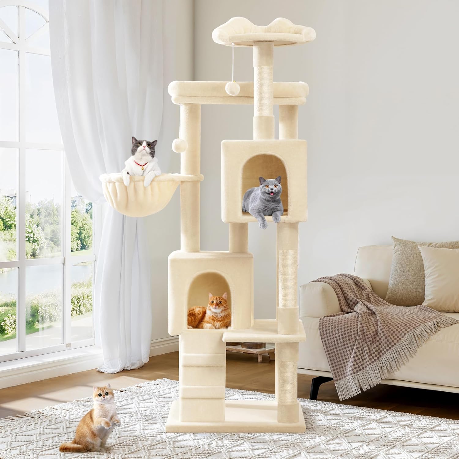 Allewie 64 Inches Cat Tree Tower/Multi-Level Activity Center for Indoor Big Felines/2 Plush Condos/2 Perchs/Basket/House/Sisal Scratching Posts/Hanging Cat Toys/Beige