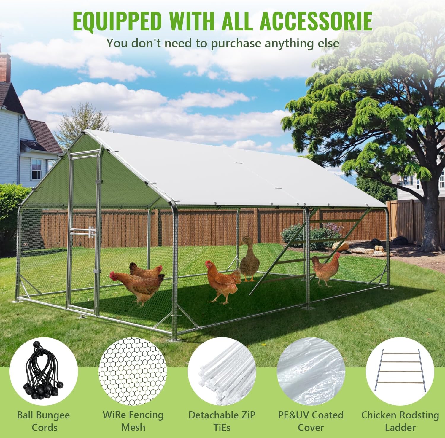 - Full Set Accessories - Package come with 30 bungee balls, 400 detachable zip ties, 2 covers and 1 roll of PVC coated chicken wire (39.3" x 118'). You don't need to buy anything else to build the chicken hen