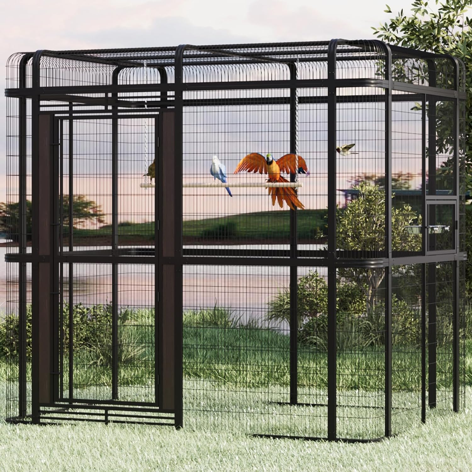 - Spacious & Customizable Design – Large parrot cage measures 86.61" L x 62.99" W x 81.5" H, offering ample room for birds to move and play. Features a dual-function main door (60.24" H x 24.8" W) that can be used as one wide entry or split into two for flexibility. The convenient feeding door (11.2" H x 19.29" W) allows easy access for food and water without disturbing your pet.