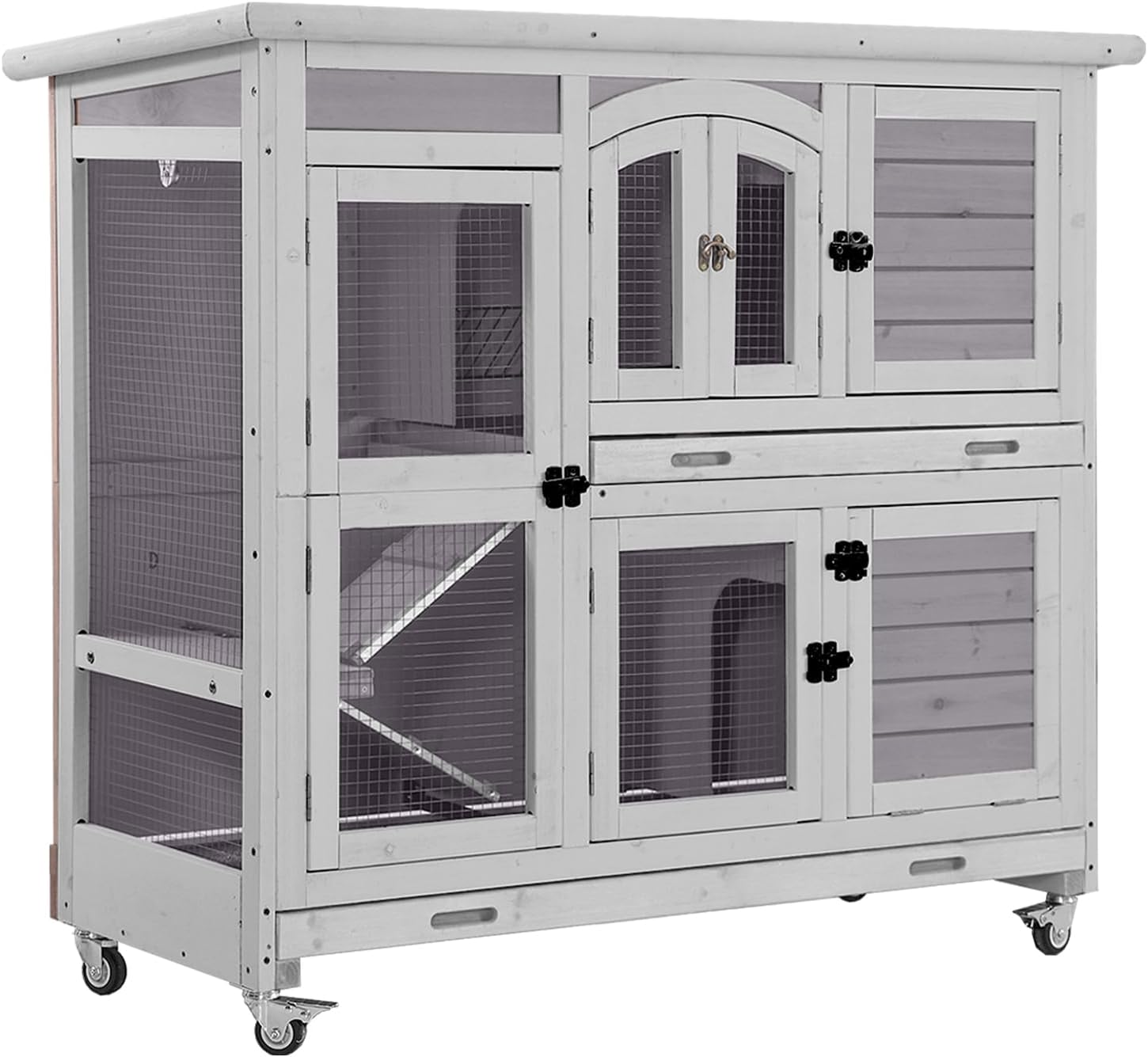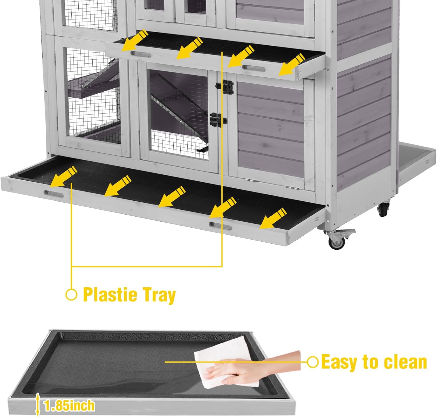 - 𝐃𝐞𝐞𝐩 𝐋𝐞𝐚𝐤 - 𝐏𝐫𝐨𝐨𝐟 𝐃𝐨𝐮𝐛𝐥𝐞 𝐓𝐫𝐚𝐲𝐬 - Two deep, leak - proof plastic trays make cleaning effortless, ensuring no spills or rust. A premium feature of this rabbit hutch for lasting hygiene