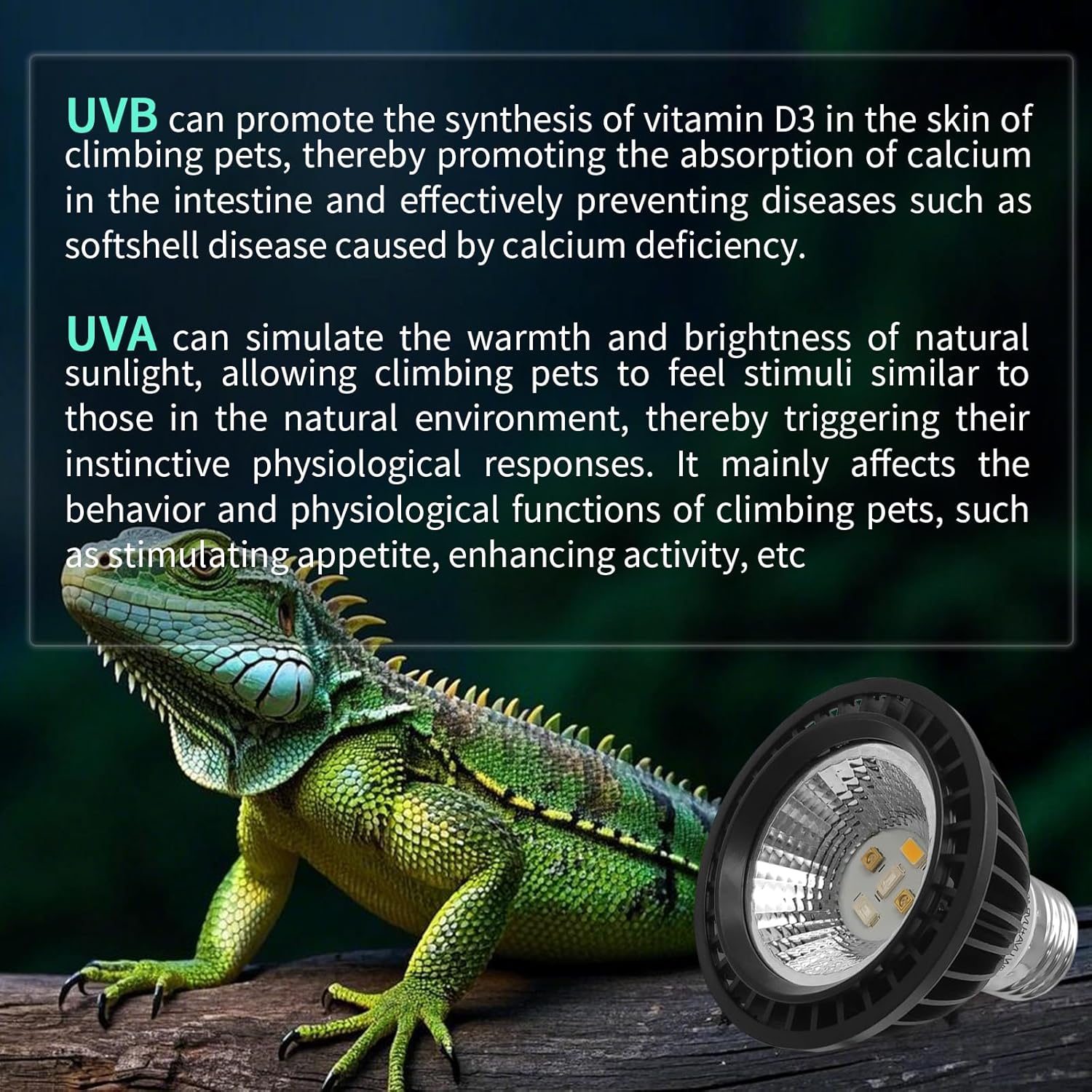 - Simulate Real Desert Environment: The 10.0 UVB bulbs for reptiles can simulate real sunlight, providing a natural environment for reptiles. Reptile uvb bulb provide necessary ultraviolet radiation for reptile pets, promote calcium absorption, promote appetite and digestion, while also promoting bone health, enhancing pet vitality, enhancing their immunity and health.