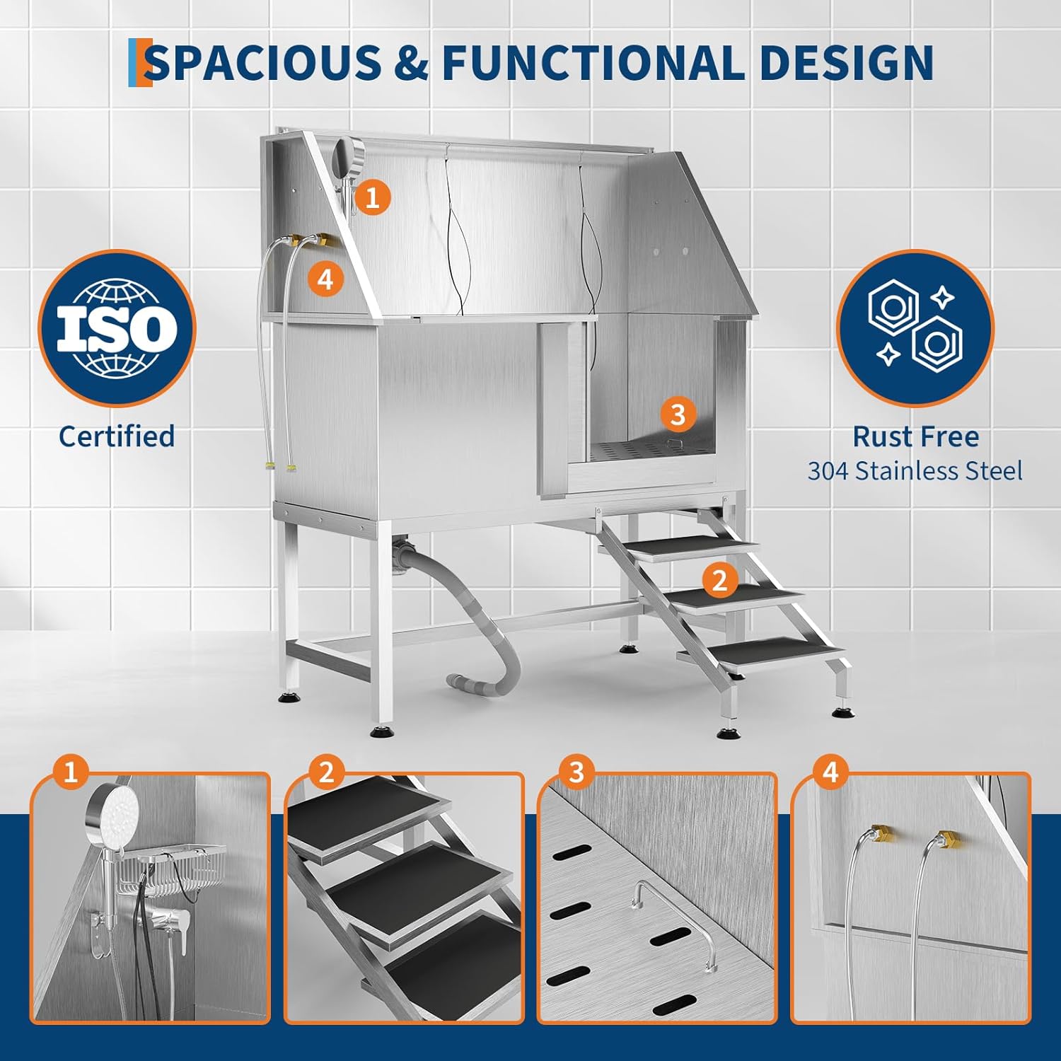 - Safety-Equipped Wash Tub Includes non-slip access ramp, storage cabinet, and locking gate mechanism to secure pets during bathing procedures.