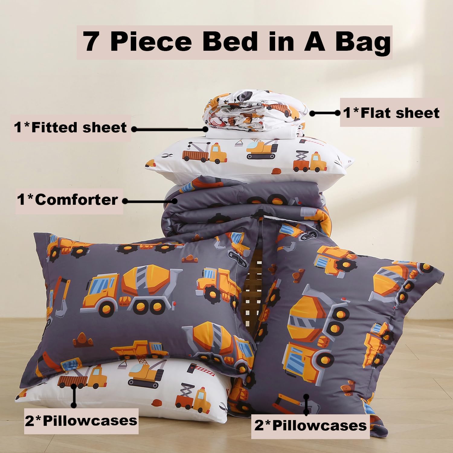 Kids Comforter Set 7 Piece Bedding Cute Car Cartoon Truck Bed Microfiber Comforter Queen Size All Season Excavator Car Truck Printed