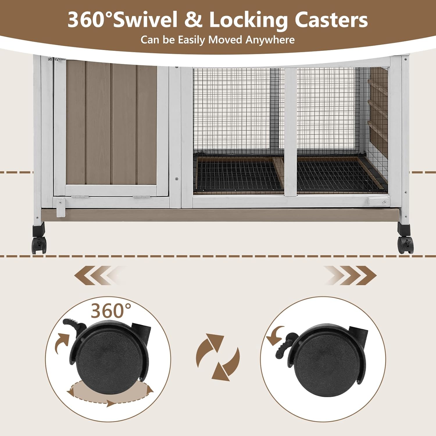 38''L Rabbit Hutch Outdoor Indoor with Wheels, Wooden Expandable 2 Story Bunny House Rabbit Cage with Run, Waterproof Roof, Pull Out Tray, Guinea Pig Cage Chicken Coop for Small to Medium Pets