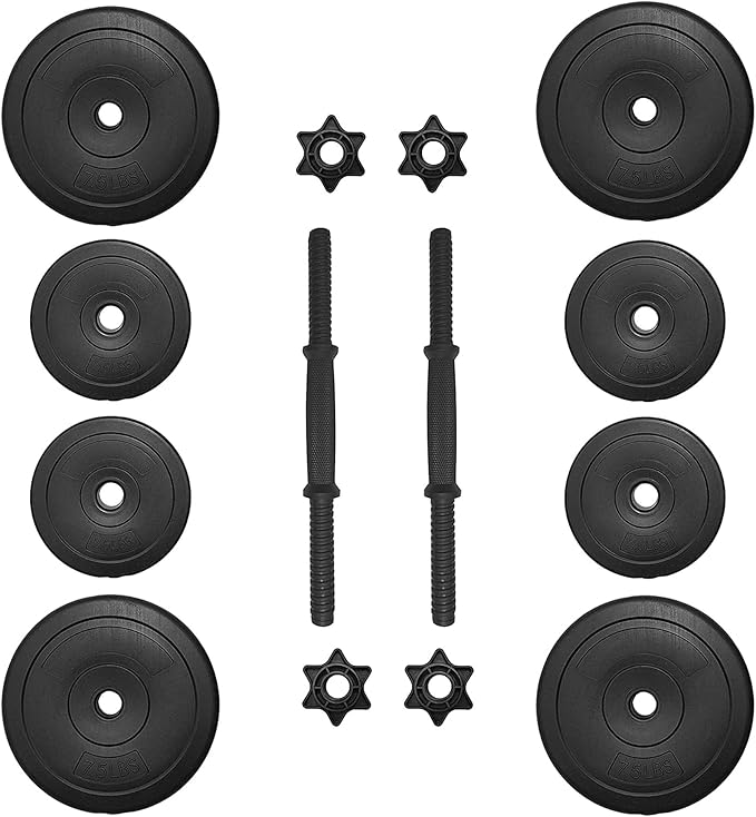 - Adjustable Weight: Weights come in 4 2.5-pound cement plates and 4 7.5 pound cement plates with 2 14-inch dumbbell handles and 4 collar locks