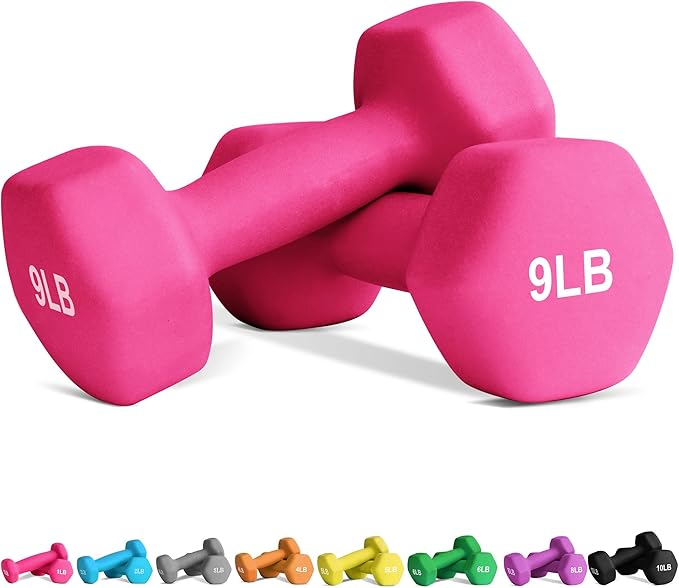 - PACKAGE INCLUDES: This weight set includes two 9 lb neoprene dumbbells (18 pounds total), making them perfect for yoga exercises and other on-the-go workouts.