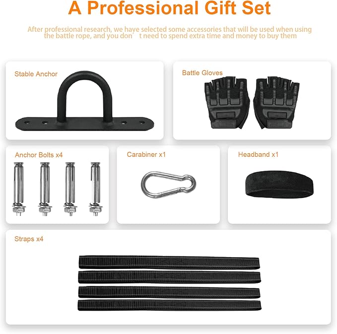 - Workout Rope 2 Inch Includes Gloves and a Sweat Head Towel as a gift: In order to prevent palm bruises or calluses, we gave gloves as gifts. We also added sweat towels to the package to make it more convenient for you to use. Stable anchor, Anchor Bolts*4, Straps*4 are also presented in this package.
