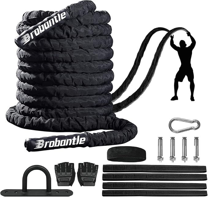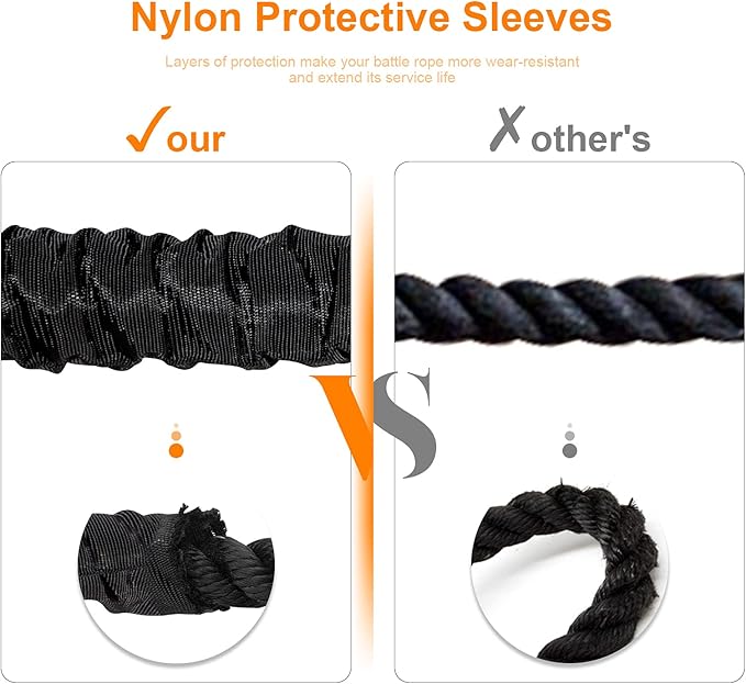 - Battle Ropes with Durable Polyester Filament Material: An extra protective cover is added to the outer layer, the battle rope is an ideal choice for beginners and serious fitness enthusiasts for home gym and outdoor exercise. The comfortable coated handle protects your hands and provides a firm grip for all your training and exercises. High tensile strength battle rope prevents breaking, abrasion, or loosening