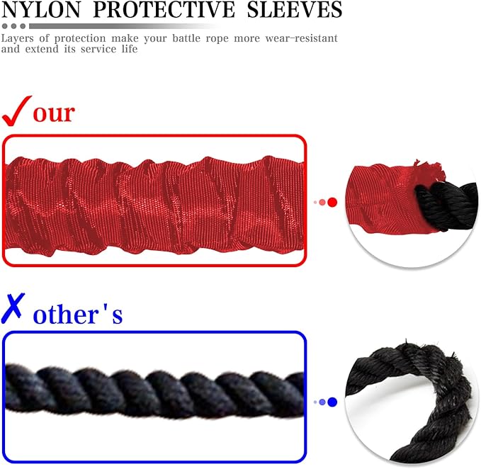 - Battle Rope with Durable Polyester Filament Material: An extra protective cover is added to the outer layer, the battle rope is an ideal choice for beginners and serious fitness enthusiasts for home gym and outdoor exercise. The comfortable coated handle protects your hands and provides a firm grip for all your training and exercises. High tensile strength exercise rope prevents breaking, abrasion, or loosening
