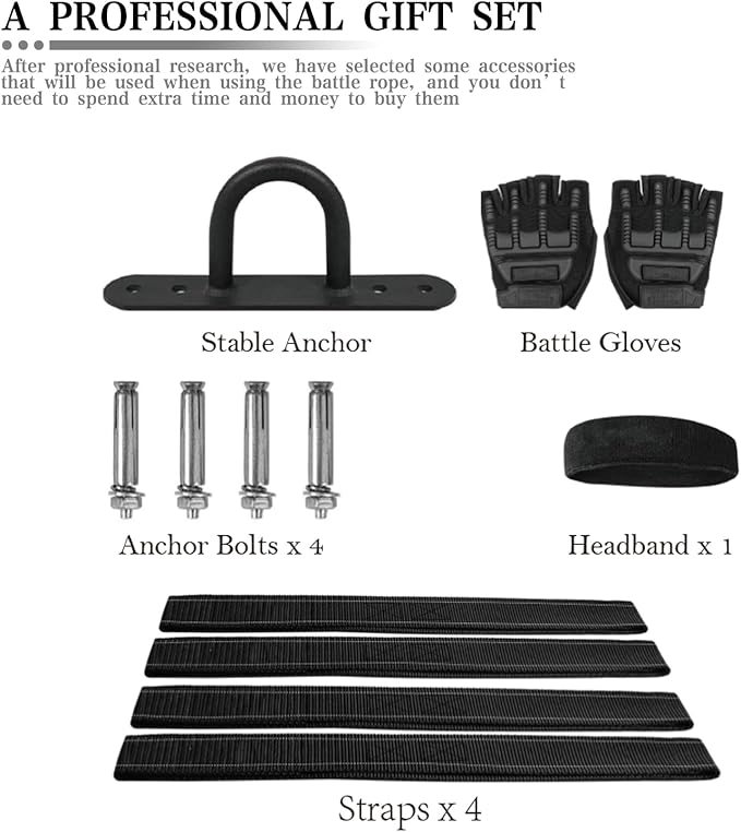 - Workout Rope Includes Gloves and a Sweat Head Towel as a gift: In order to prevent palm bruises or calluses, we gave gloves as gifts. We also added sweat towels to the package to make the gym rope more convenient for you to use. Stable anchor, Anchor Bolts*4, Straps*4 are also presented in this package.