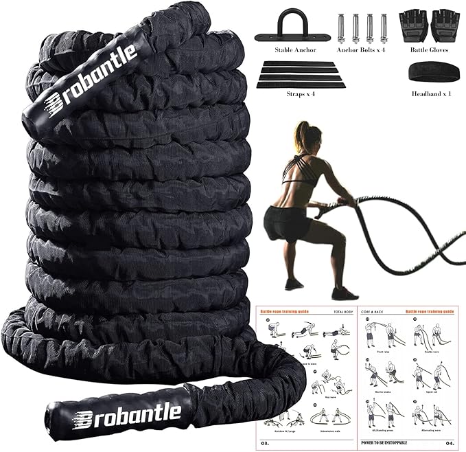 - Battle Rope with Durable Polyester Filament Material: An extra protective cover is added to the outer layer, the battle rope is an ideal choice for beginners and serious fitness enthusiasts for home gym and outdoor exercise. The comfortable coated handle protects your hands and provides a firm grip for all your training and exercises. High tensile strength exercise rope prevents breaking, abrasion, or loosening