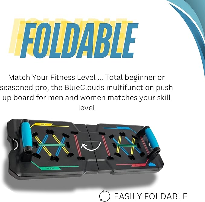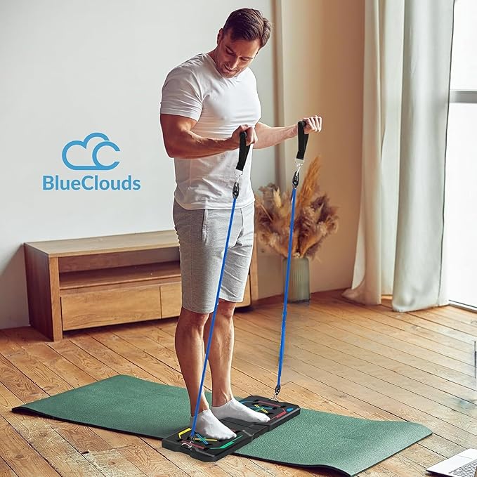 - Match Your Fitness Level: The Blue Clouds multifunction push up board is designed for beginners and seasoned pros, with convenient color coding to indicate where to place the push-up handles for targeting specific muscles.