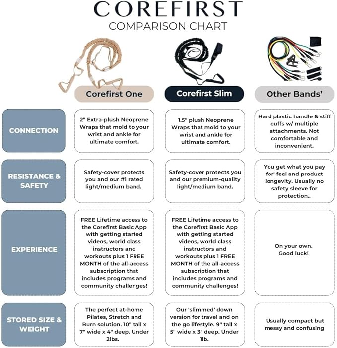 - ✔️COREFIRST SLIM: Meet the Corefirst Slim, the perfect blend of lightweight design and powerful resistance. Designed for the traveler in you, this band ensures that no matter where you are, your fitness routine remains uninterrupted. Experience the same resistance as the Level One, but in a more compact and travel-friendly form. Whether you're on a business trip, vacation, or just out and about, the Corefirst Slim is your go-to for a quick and effective workout