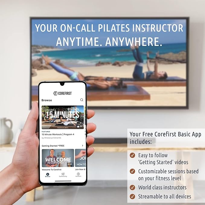 - ✔️TOP RATED APP! Corefirst Basic App is included and has dozens of easy-to-follow videos covering set up, getting started tips and Pilates workout fundamentals for beginners. Best of all, it comes with 15-40 minute Pilates workouts led by 1st class Instructors in beautiful locations and even includes sample Corefirst Stretch, Strength and Burn (cardio) workouts! Every purchase also includes a free 14-day trial of the All-Access Premier Membership.