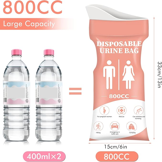 - 【Disposable Urinal Bag】The multi-purpose emergency urine bag can be used in multiple occasions, and can be used in emergency situations such as pregnant women, car-sickness, vomiting, traffic jams and can also be used in outdoor activities such as hiking and camping.