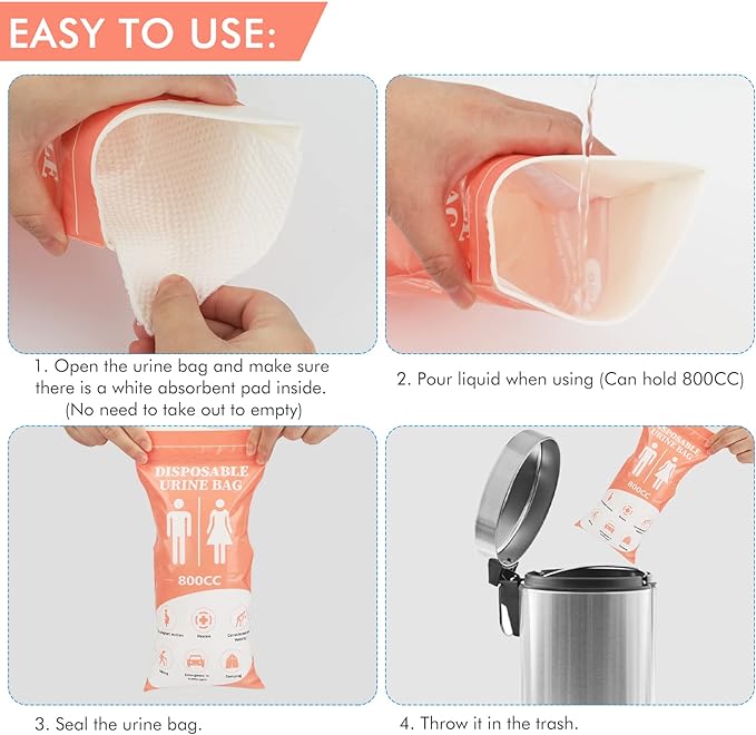 - 【Easy to Use】The emergency portable urine bag is very easy to use. Just open it and make sure there is a white absorbent pad in the pee bag before use, (no need to open or empty during use), it can hold max 800ml capacity and turn it into a gel in a short time. After use, pls seal it and throw it in the trash can.
