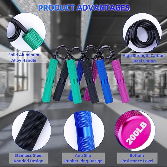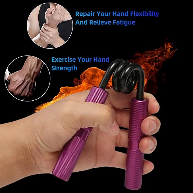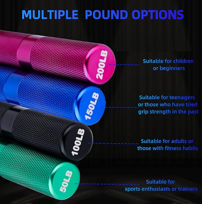 - Hand Exercises for Strength:Our hand grip strengthener set offers 4 levels of resistance (Green 50, Black 100, Blue 150, Purple 200 LBS) to meet the training needs of different groups. You can also gradually increase the strength level of exercise according to the color, and improve grip strength. Its ergonomic and ambidextrous design enables efficient finger, hand, wrist, and forearm muscle training for improved grip strength.