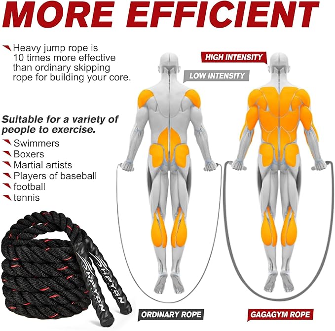 - 【Perfect Choice for Fitness】It's no secret that skipping rope is a great way to get fit, using a heavy jump rope helps to exercise the whole body, jumping with weighted jump rope for five minutes is equivalent to 30 minutes with ordinary skipping rope, Double weight multi-fold fat burning and can be effective for increasing strength and promoting weight loss, in order to better yourself, please use weighted jump rope to jumping now!
