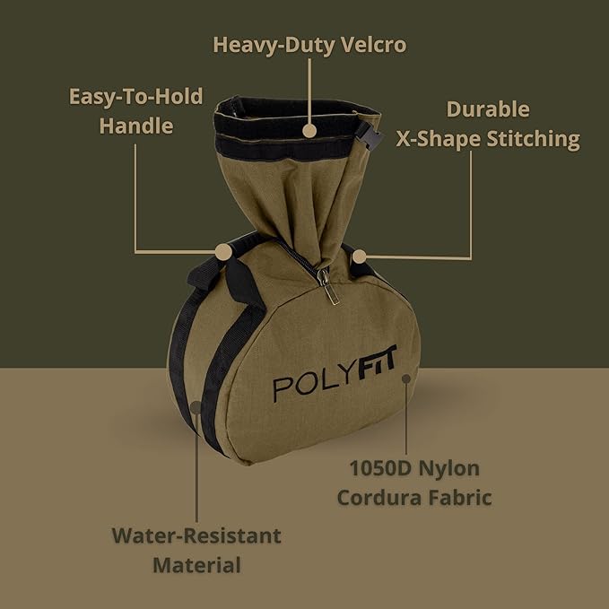 - GUARANTEED LEAK-PROOF & DURABLE | NON-SLIP HANDLE. The Polyfit Kettlebell Sandbag is secured with enforced stitching on both the velcro and the zipper, so you can do your strength training and conditioning exercises with confidence. The handle is designed with a comfortable grip, which allows for better execution.