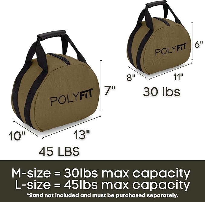 - AVAILABLE IN 2 SIZES | KETTLEBELL SANDBAG FOR WORKOUT. Polyfit’s Kettlebell Sandbag is the easier alternative to buying a full set of plates and weights. With 2 sizes to choose from: 30lbs max capacity and 45lbs max capacity, you get all of the benefits of kettlebell training equipment without the hefty price tag. Just add sand for a sandbag workout that will help you develop functional strength.