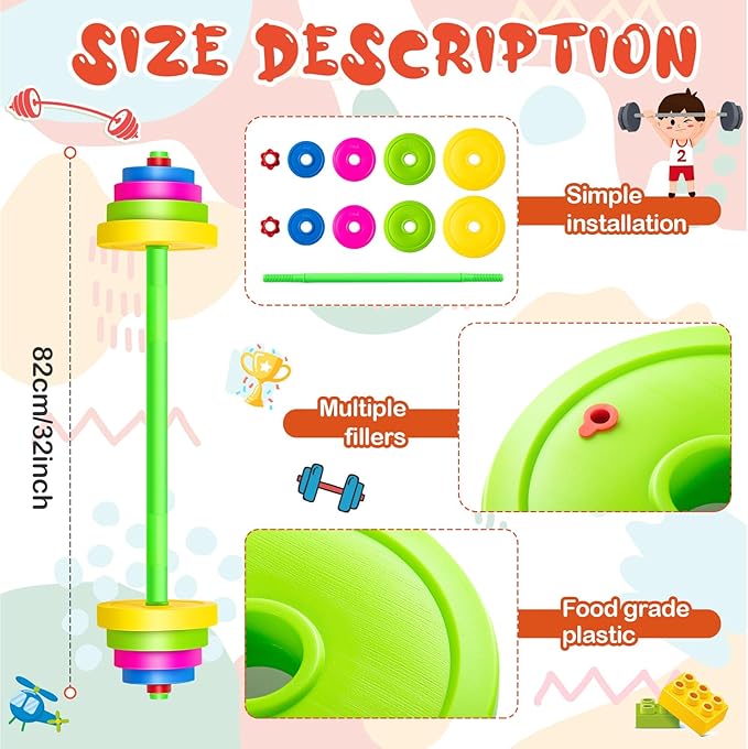 • Adjustable Weight: toddler exercise equipment comes with 8 weight plates that can be filled with sand or water, you can gradually increase the weight as your child grows, which can exercise your child's hand, eye, arm coordination and make him stronger and more powerful