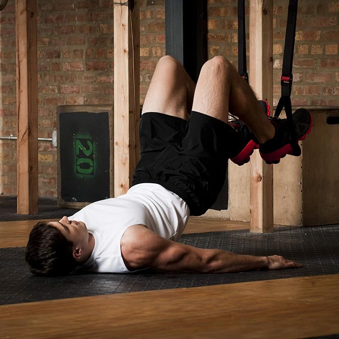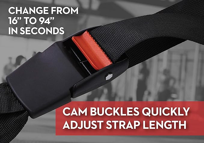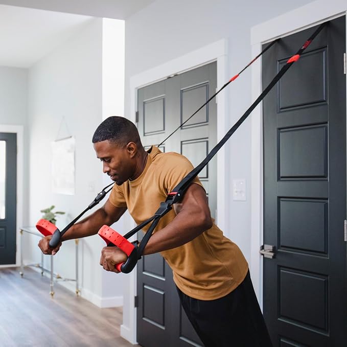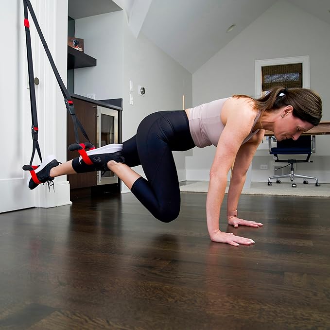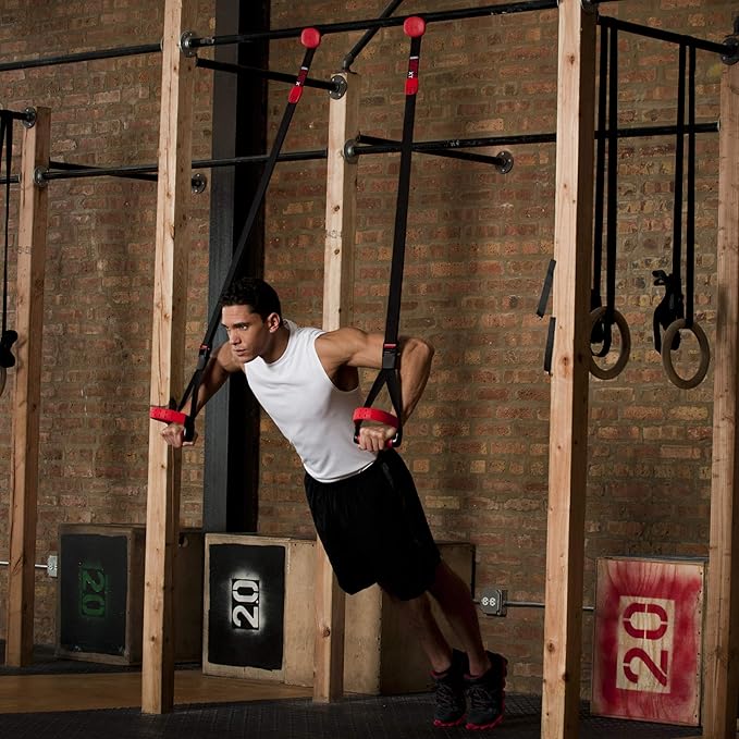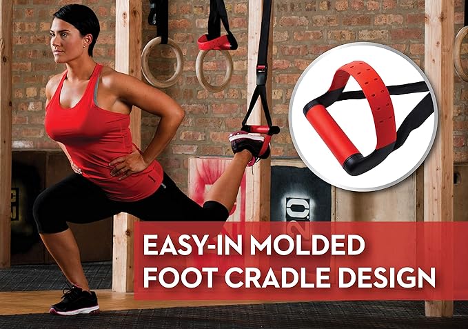 - Industrial-strength suspension straps are built for punishing workouts. Quickly change between high and low exercises. EASY-IN molded foot cradles retain shape for SAFER use when training lower body