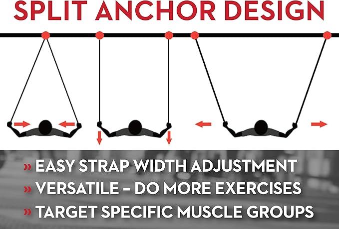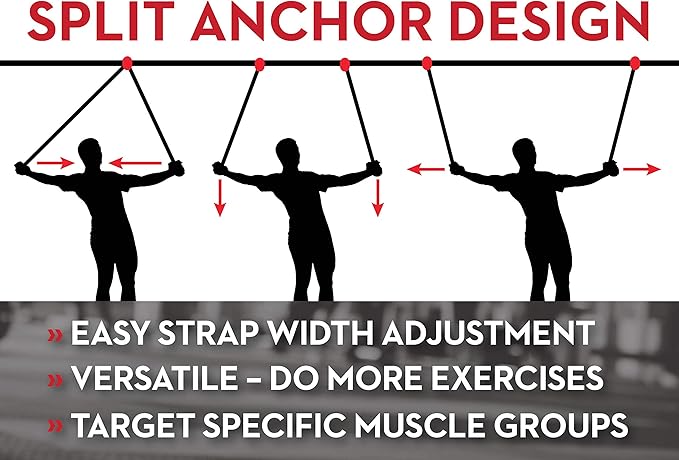 - The patented split anchor design allows for narrow, neutral and wide angles of resistance, targeting more muscle groups than single anchor versions. The best door exercise equipment on the market.